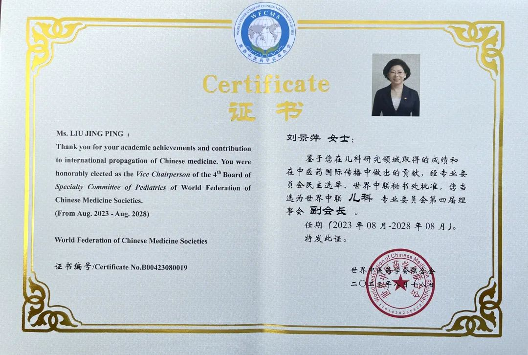 美狮贵宾会官网药业集团党委书记、董事长刘景萍当选世界中医药学会联合会儿科专业委员会第四届理事会副会长